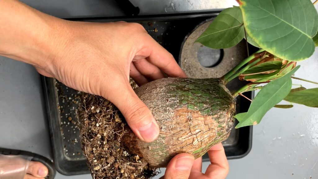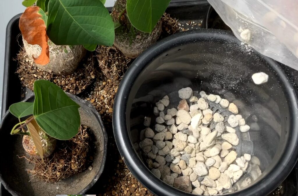 それまで私は、塊根植物といえば水はけ重視で、できるだけ軽石や砂を混ぜた土で育てるのがいいと思い込んでいました。乾燥に強い植物だから、水分を保持しすぎない方が安心だろうと。
