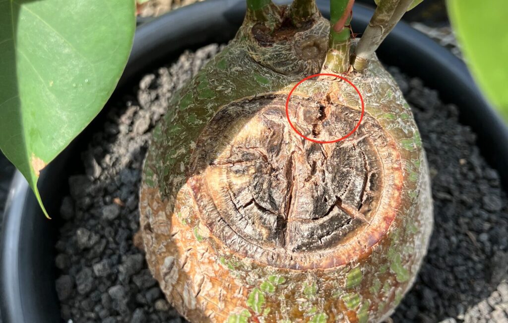 下の写真は過去に選定した箇所がひび割れになります。株の膨らみに伴い、より深く亀裂が入りました。